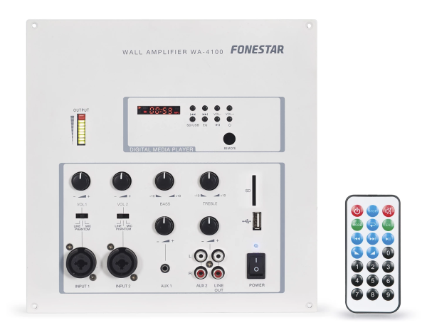 | CARACTERÍSTICAS: | Amplificador de pared para montaje en superficie o empotrado. Caja de superficie que facilita la instalación y el conexionado. Circuito amplificador clase D. Fuente de alimentación conmutada. Reproductor USB/SD de ficheros MP3. Mando a distancia para reproductor MP3. |