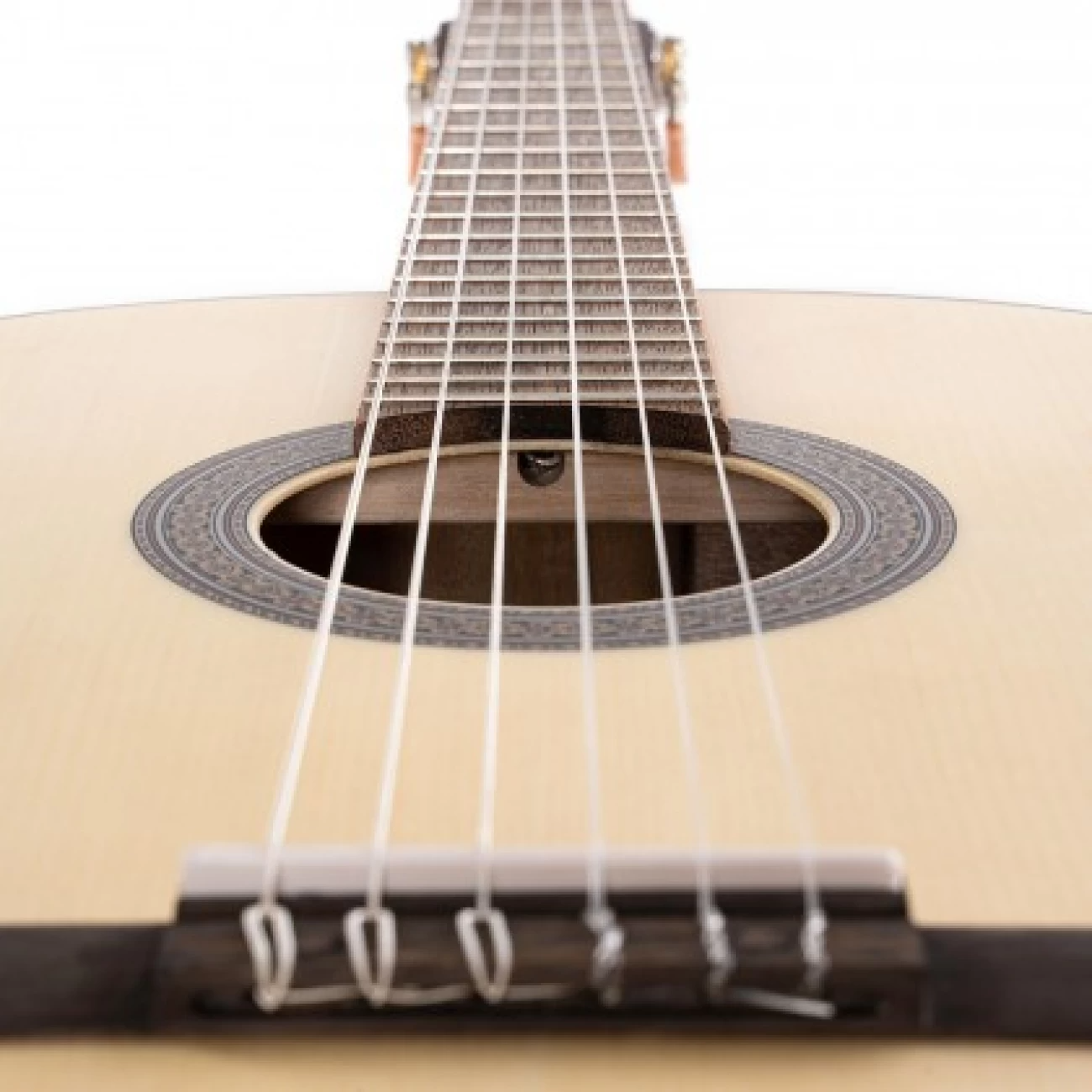 El refuerzo tradicional del ventilador de guitarra clásica se utiliza internamente para maximizar las características vibratorias de las cuerdas de nylon.
