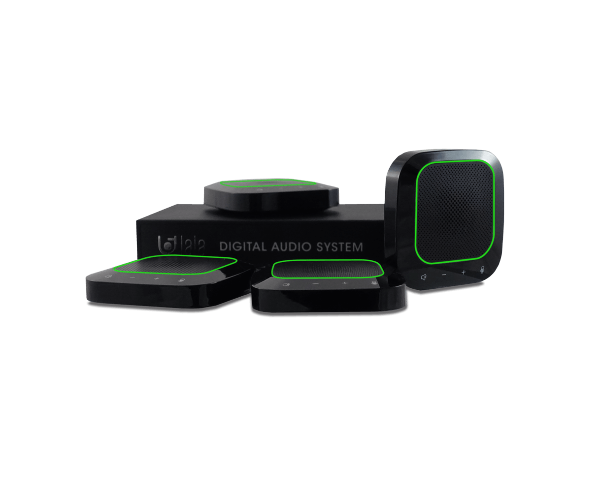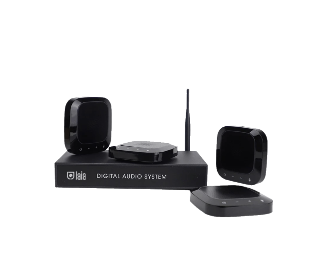Laia t-Pod Quad 22 es un controlador de audio para videoconferencias en red basado en la comunicación por internet. Con 4 micrófonos omnidireccionales unidos en cascada inalámbrica de 2.4G. Puede conectarse a una matriz de altavoces activos.